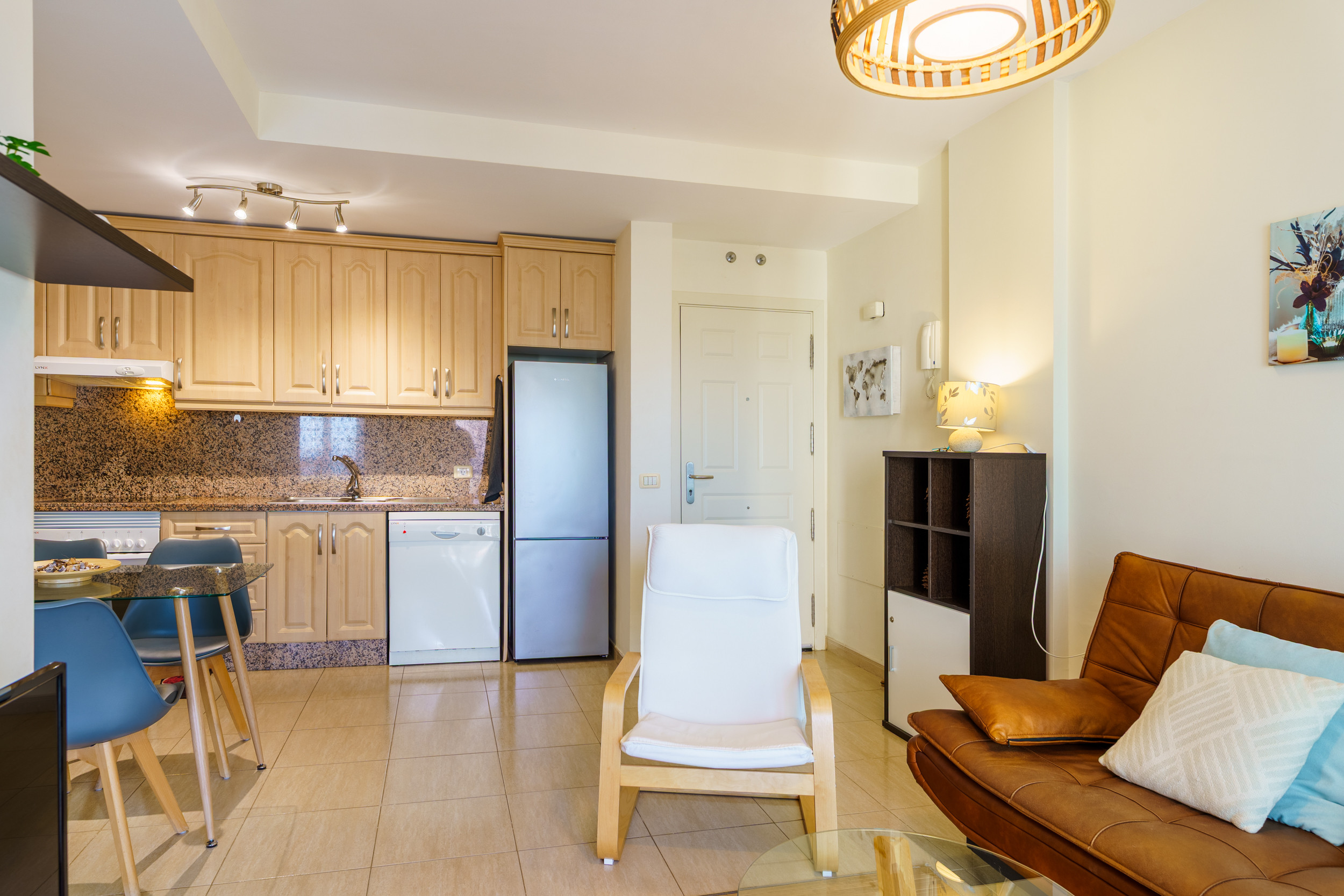 El apartamento se completa con un salón con cocina de estilo americano, totalmente integrado y luminoso. En el salón encontrarás un sofá cama, lo que permite alojar hasta un máximo de 3 huéspedes, siendo una opción perfecta tanto para parejas como para pequeños grupos o estancias prolongadas.