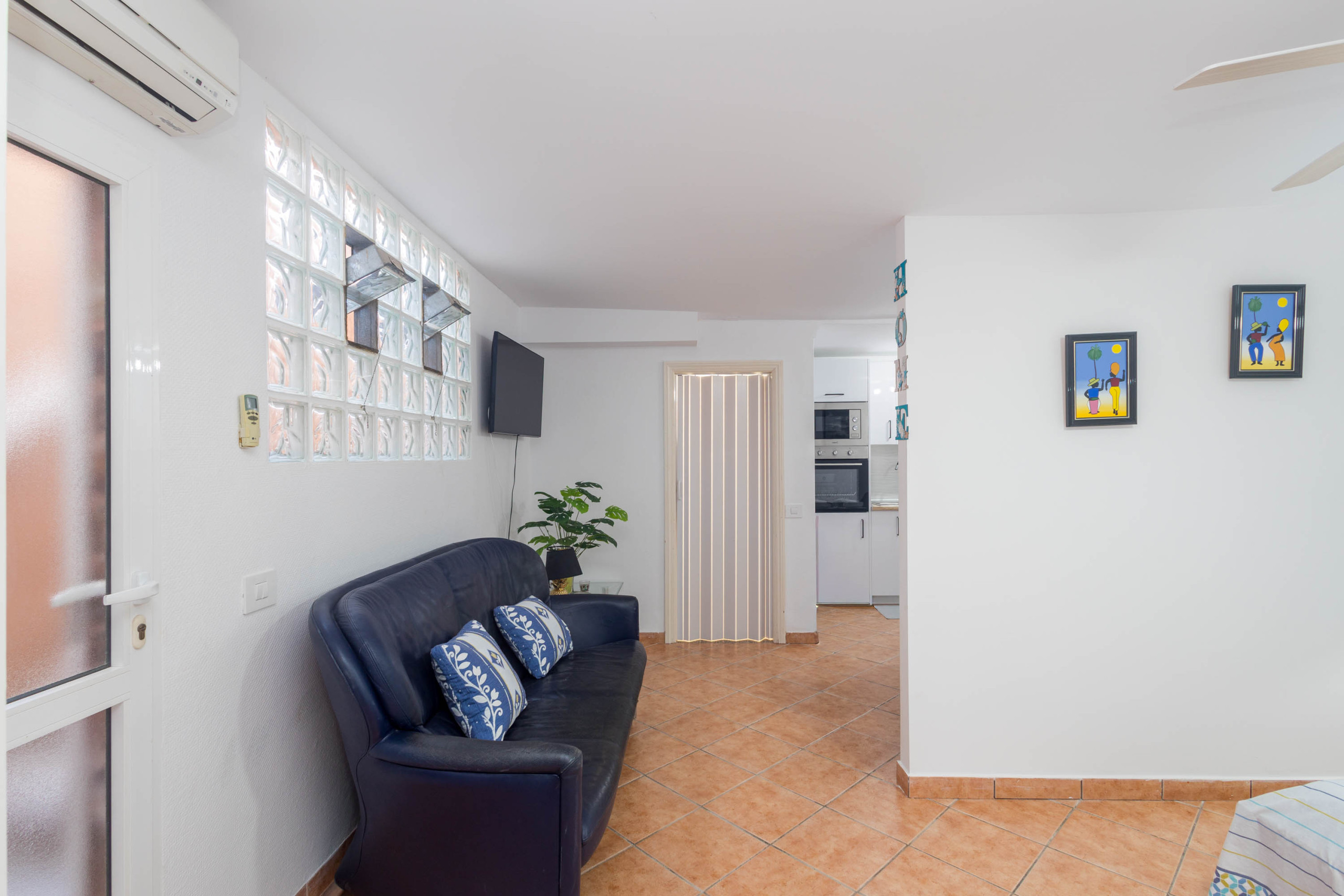 The accommodation features 40 m² of interior space distributed across an independent bedroom, a living room with a fully equipped integrated kitchen, and a complete bathroom. The entire apartment is equipped with air conditioning, ensuring a pleasant temperature throughout the year.